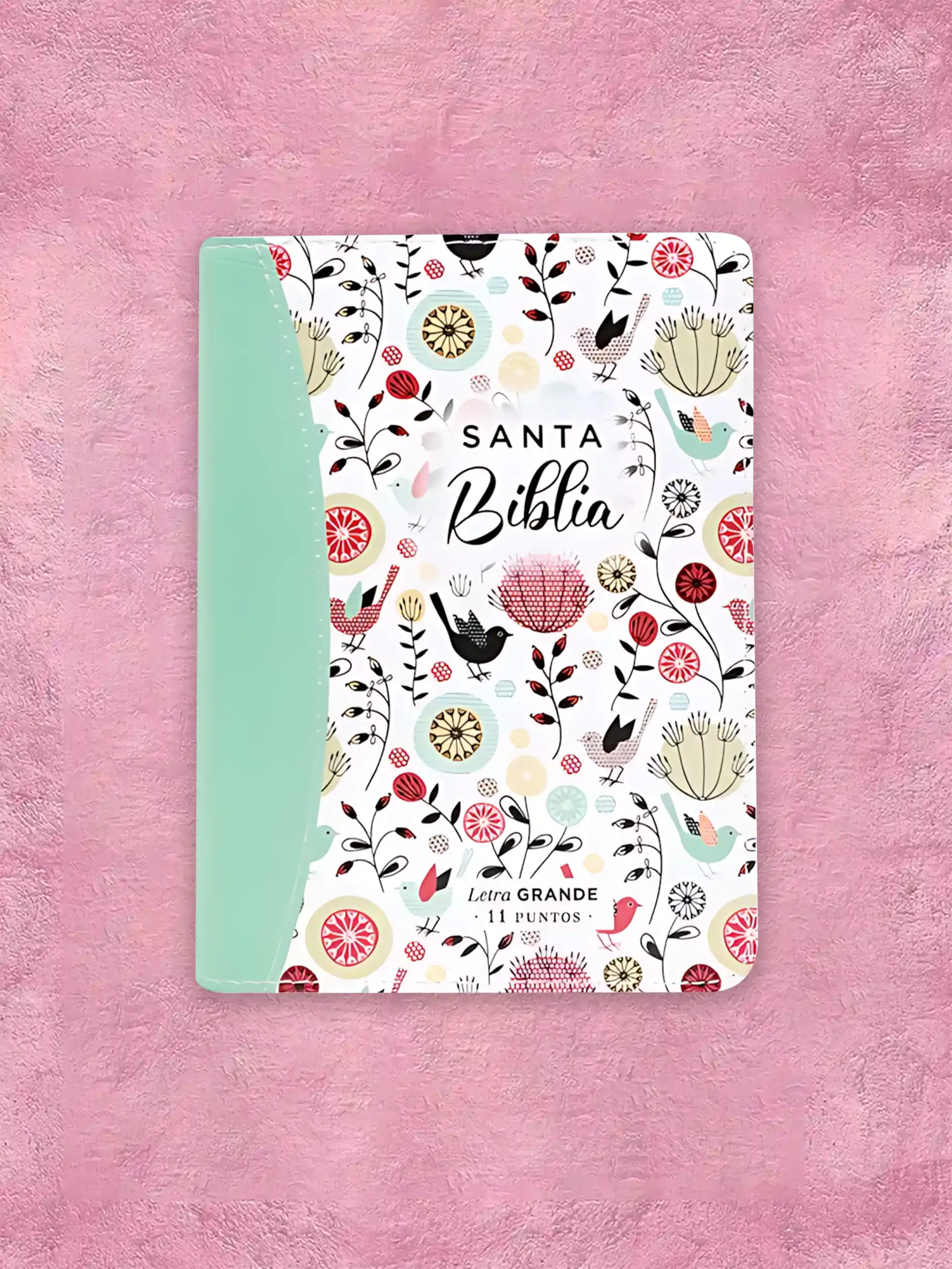 Letra grande 11 pt, pasta flexible, bordes floreados.