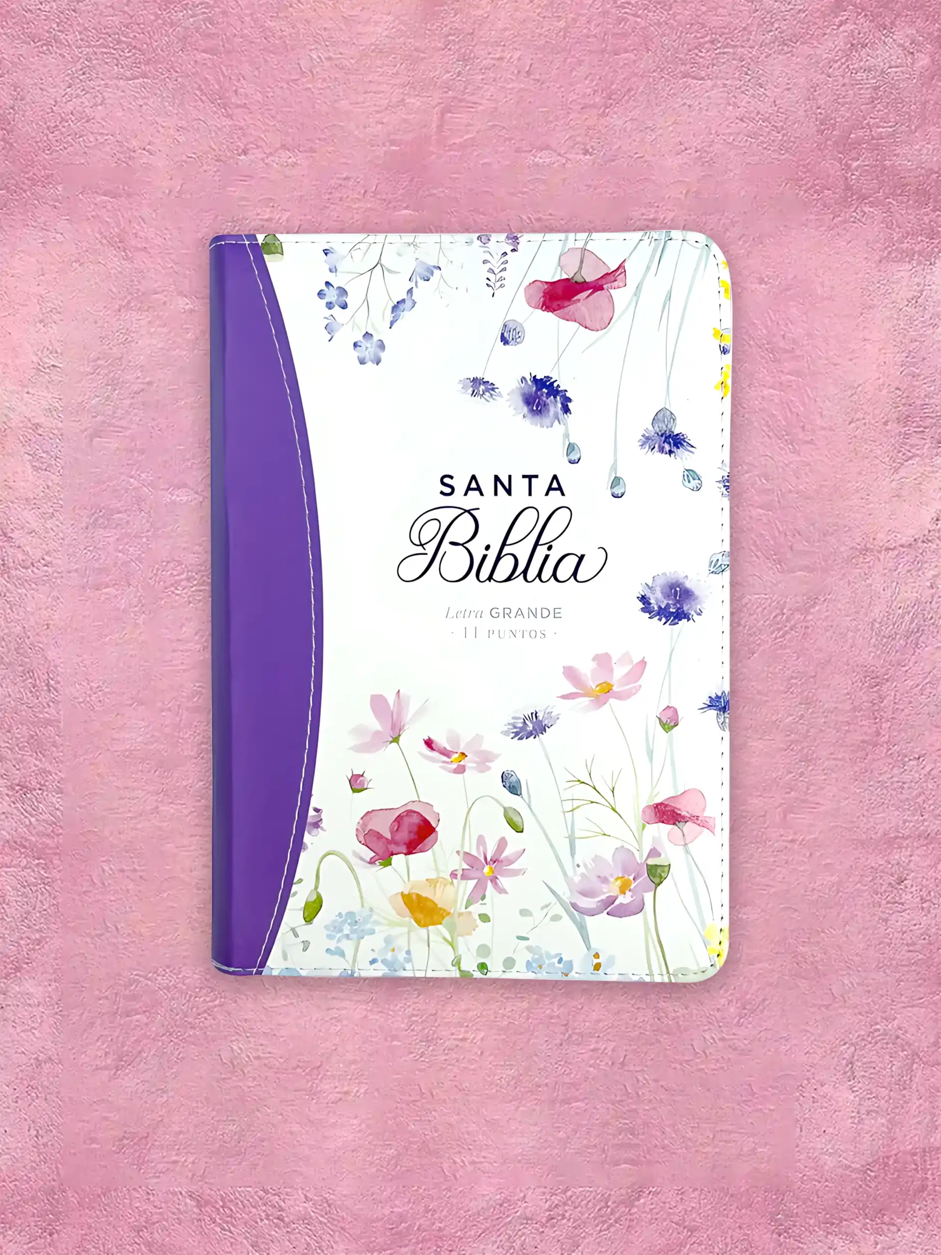 Letra grande 11 pt, forro incorporado, pasta flexible, bordes floreados.