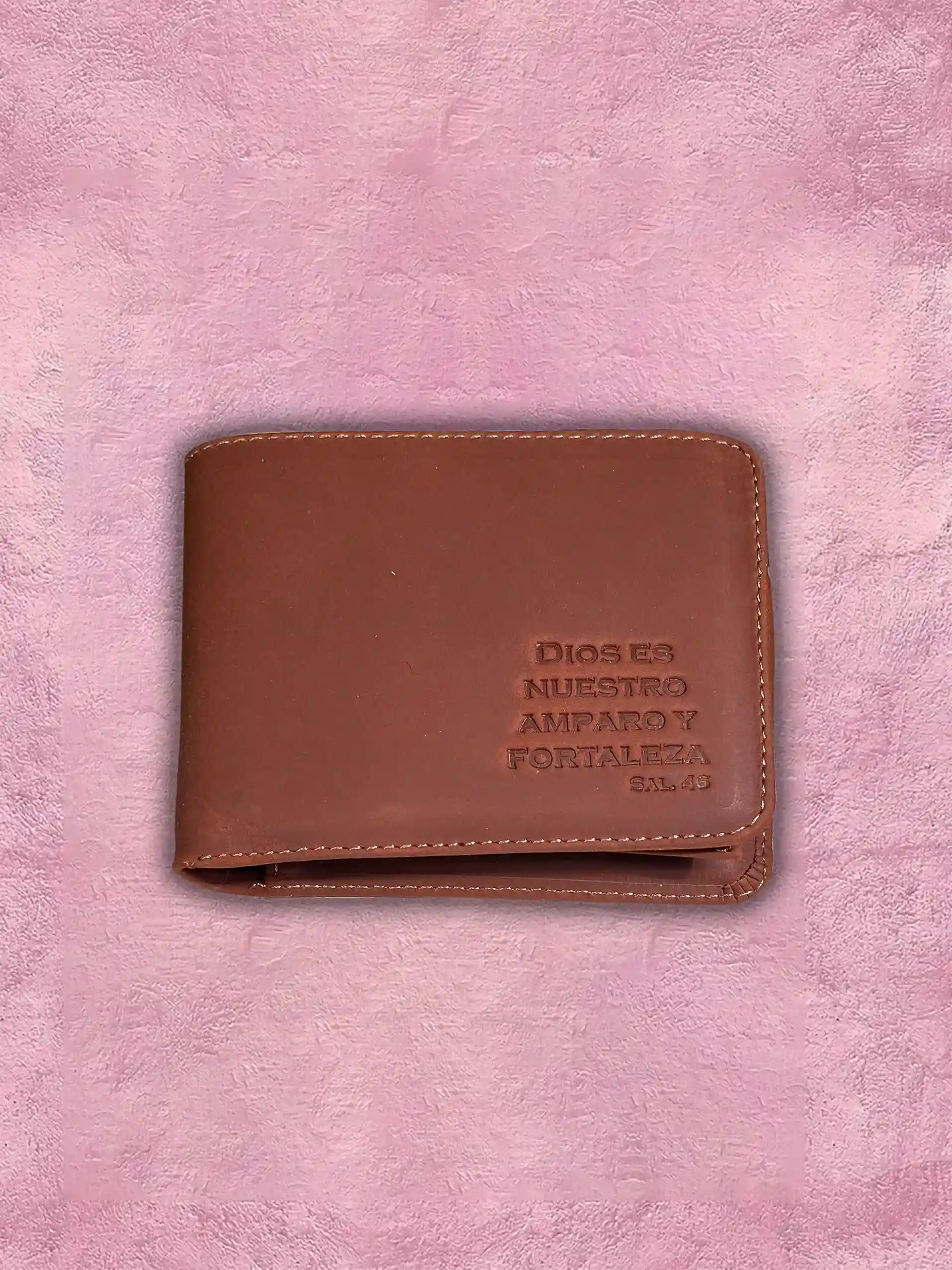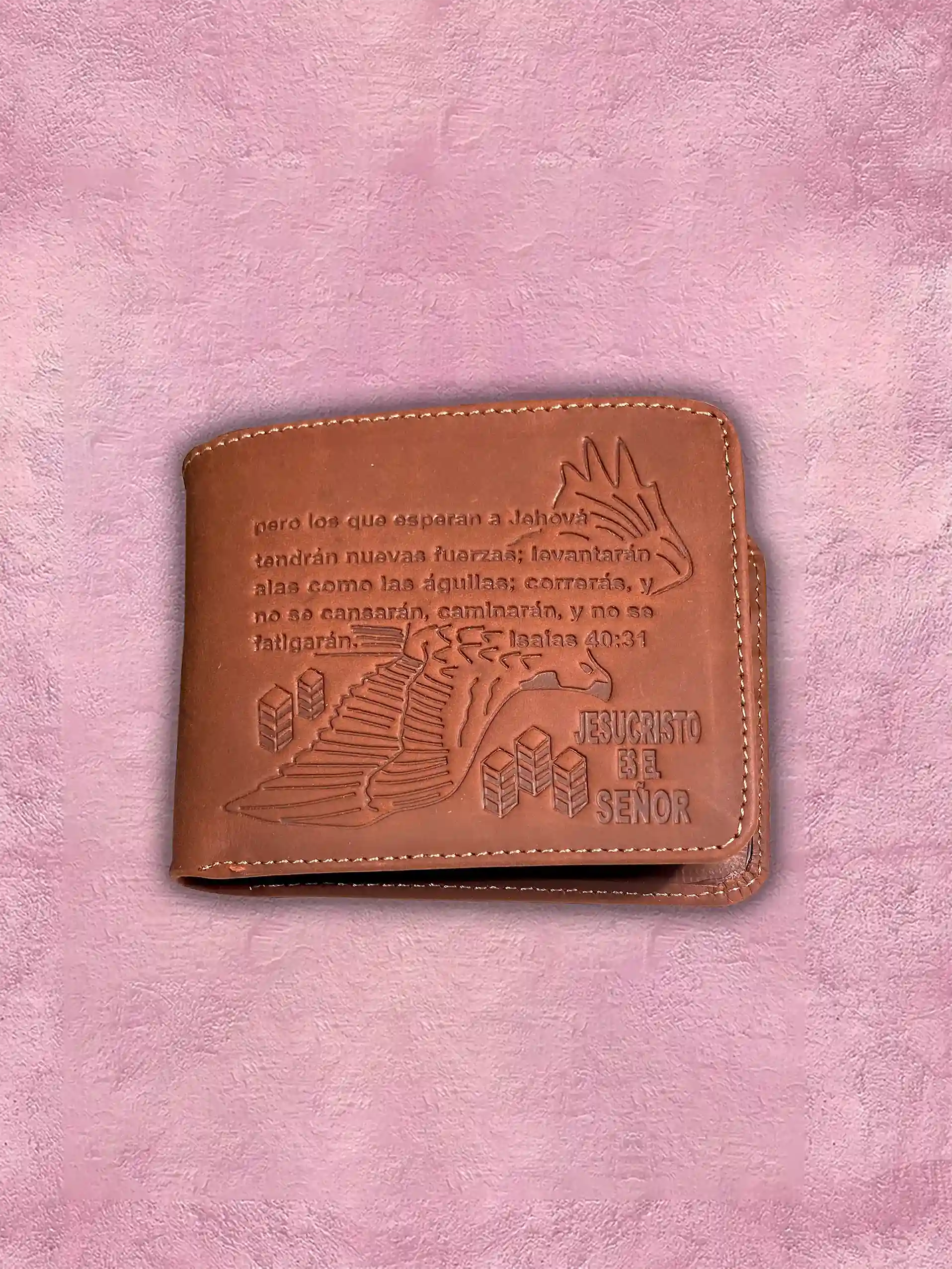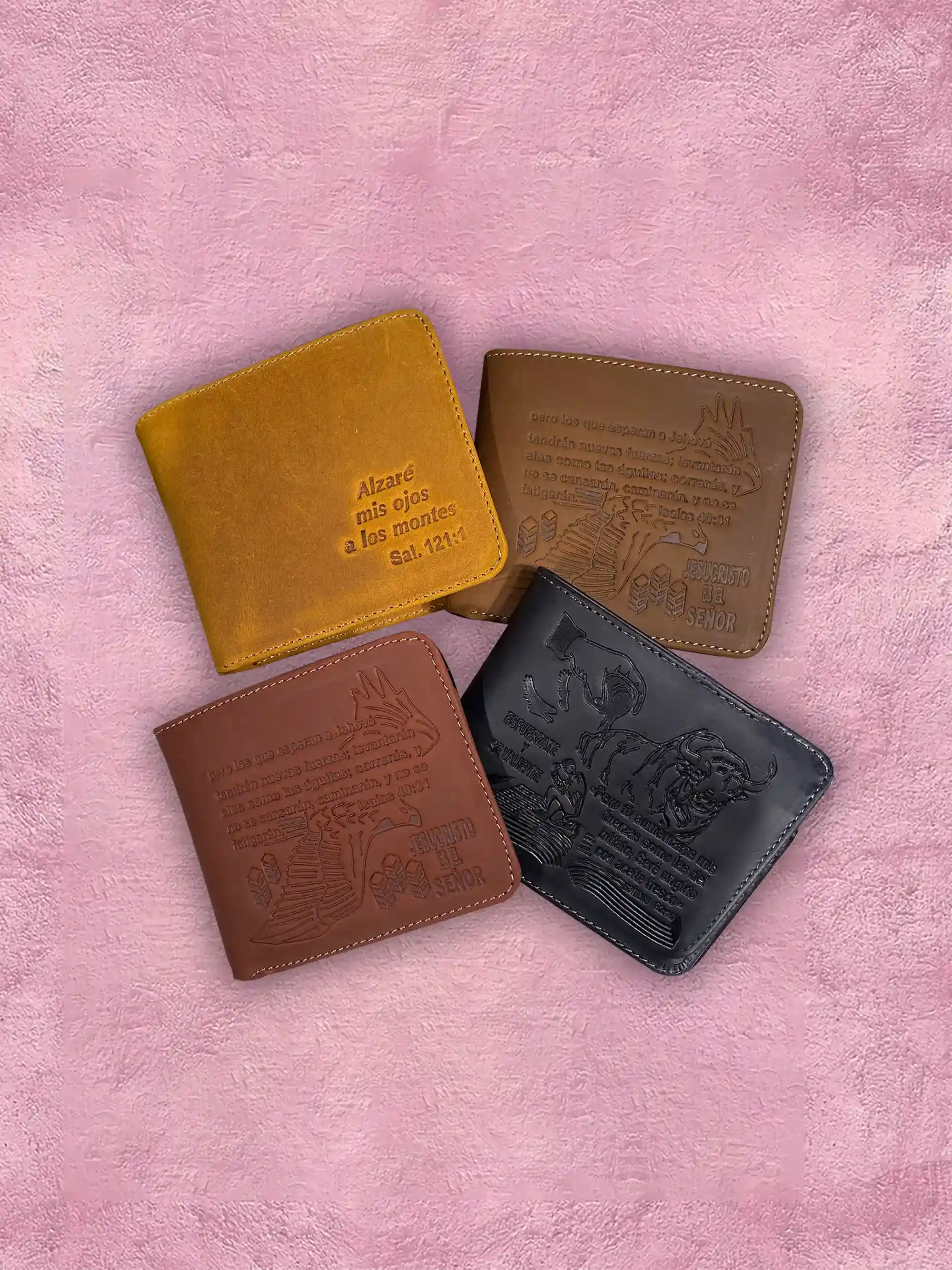 Nuestras billeteras de cuero puro combinan elegancia, durabilidad y propósito. Cada diseño incluye un mensaje cristiano grabado que inspira y acompaña cada día. Son el detalle perfecto para quienes desean llevar su fe con estilo y discreción. Un accesorio funcional, resistente y elegante en tu día a día.