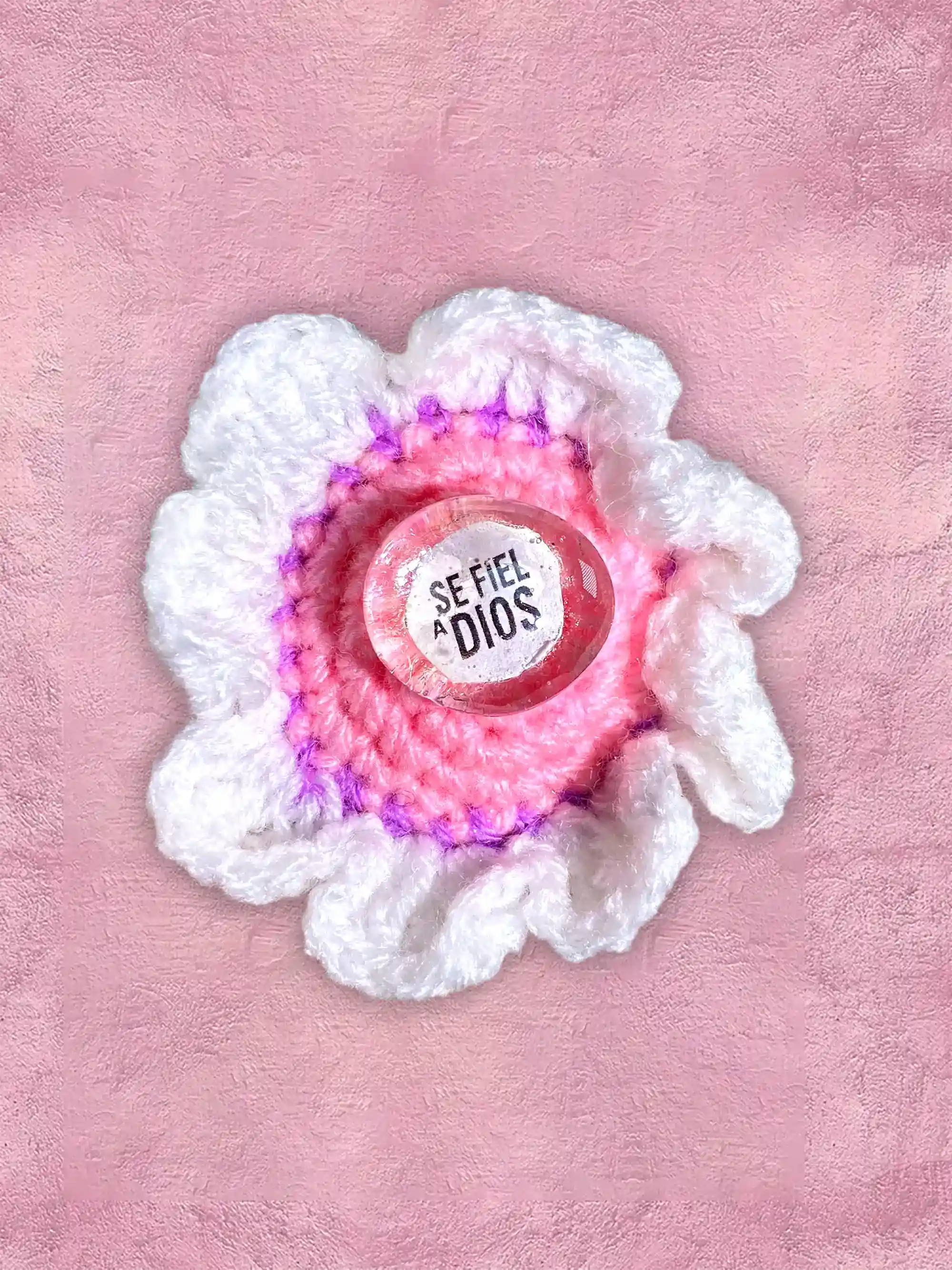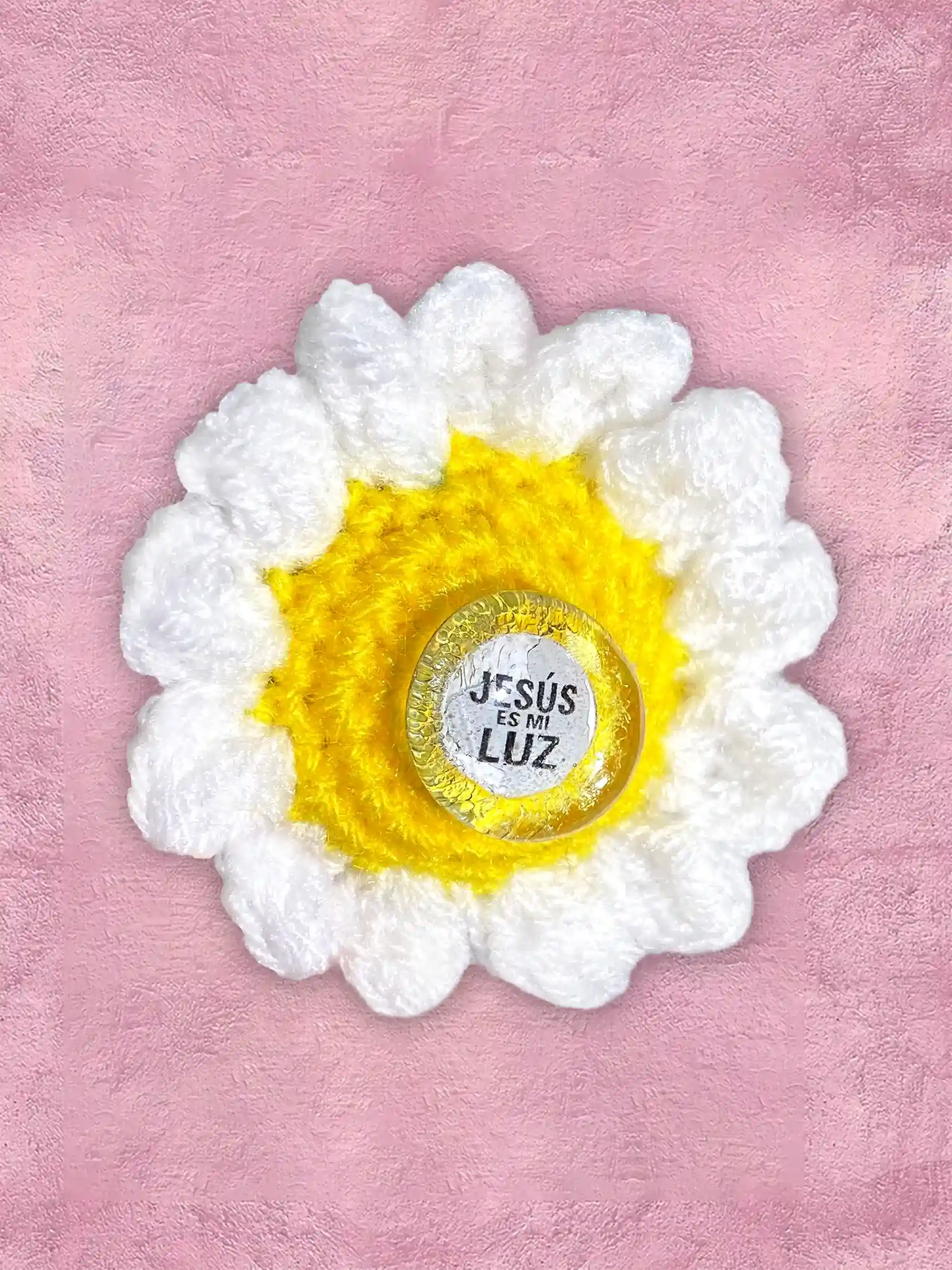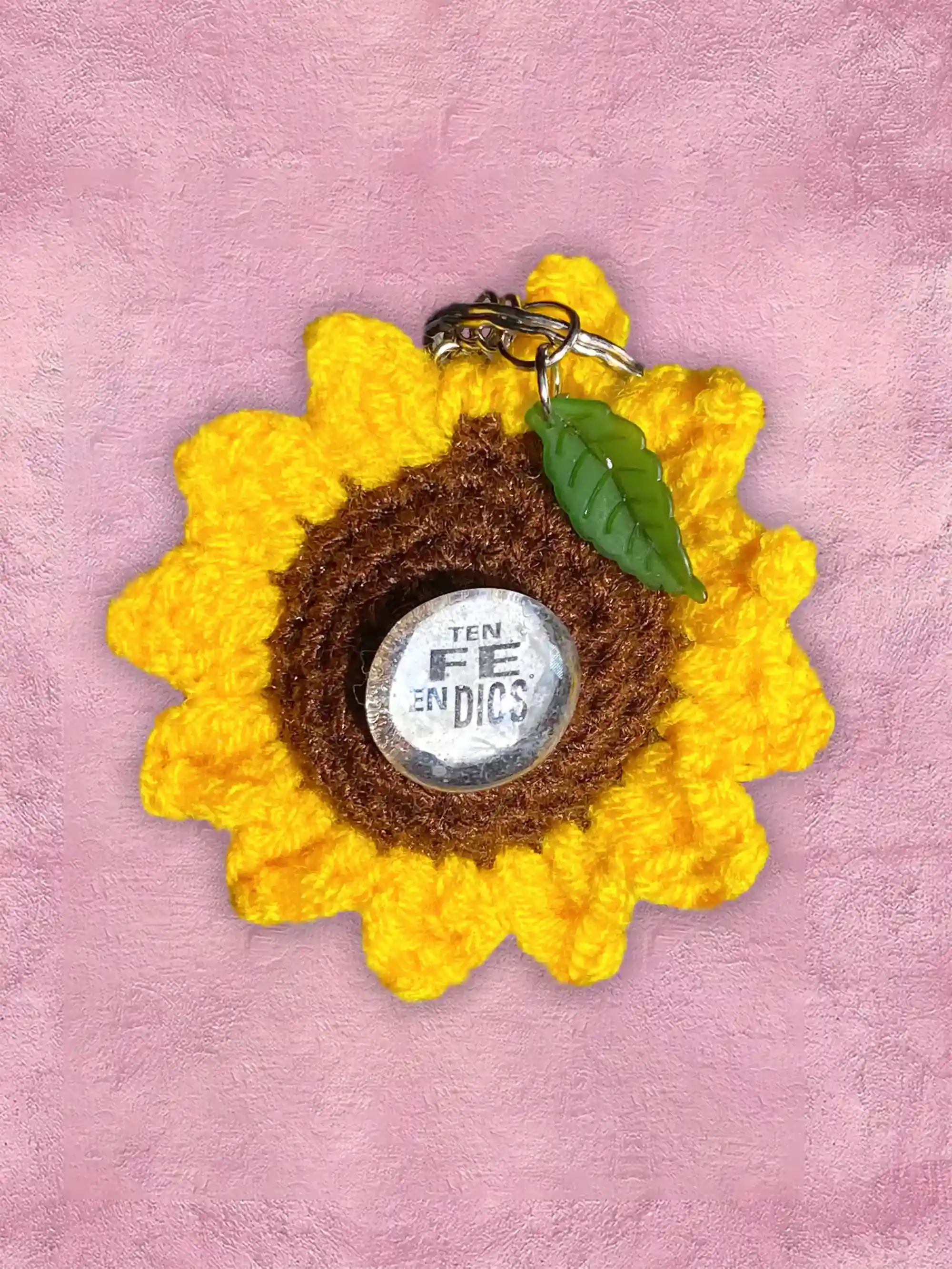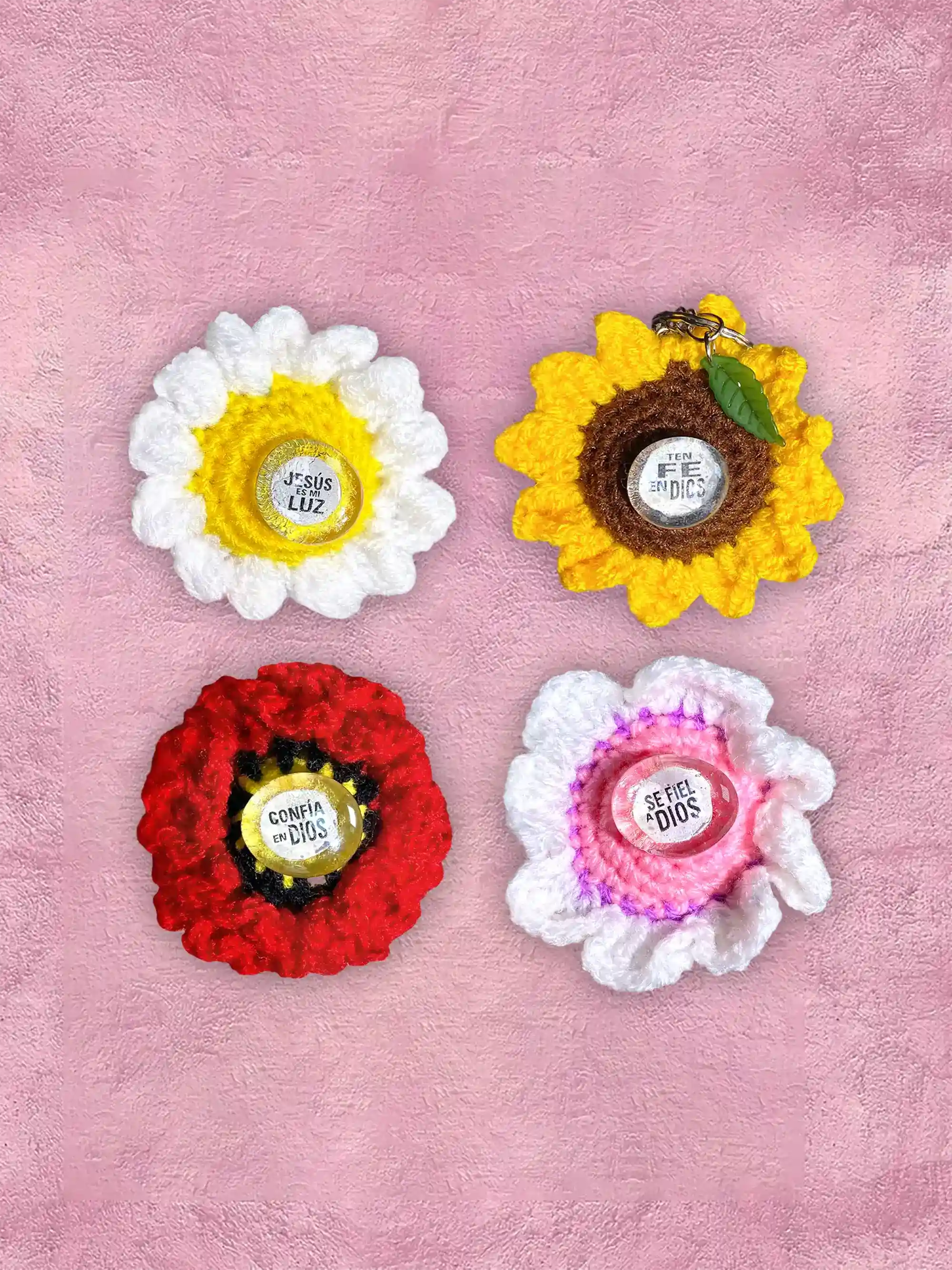 Llaveros de flores tejidos con lana, con frases cristianas. Ideales para adornar tus llaves, mochilas o bolsos con un nuevo estilo. Su diseño combina fe, creatividad y detalle en cada modelo. Cada pieza presenta flores de colores que aportan un toque alegre y artesanal.