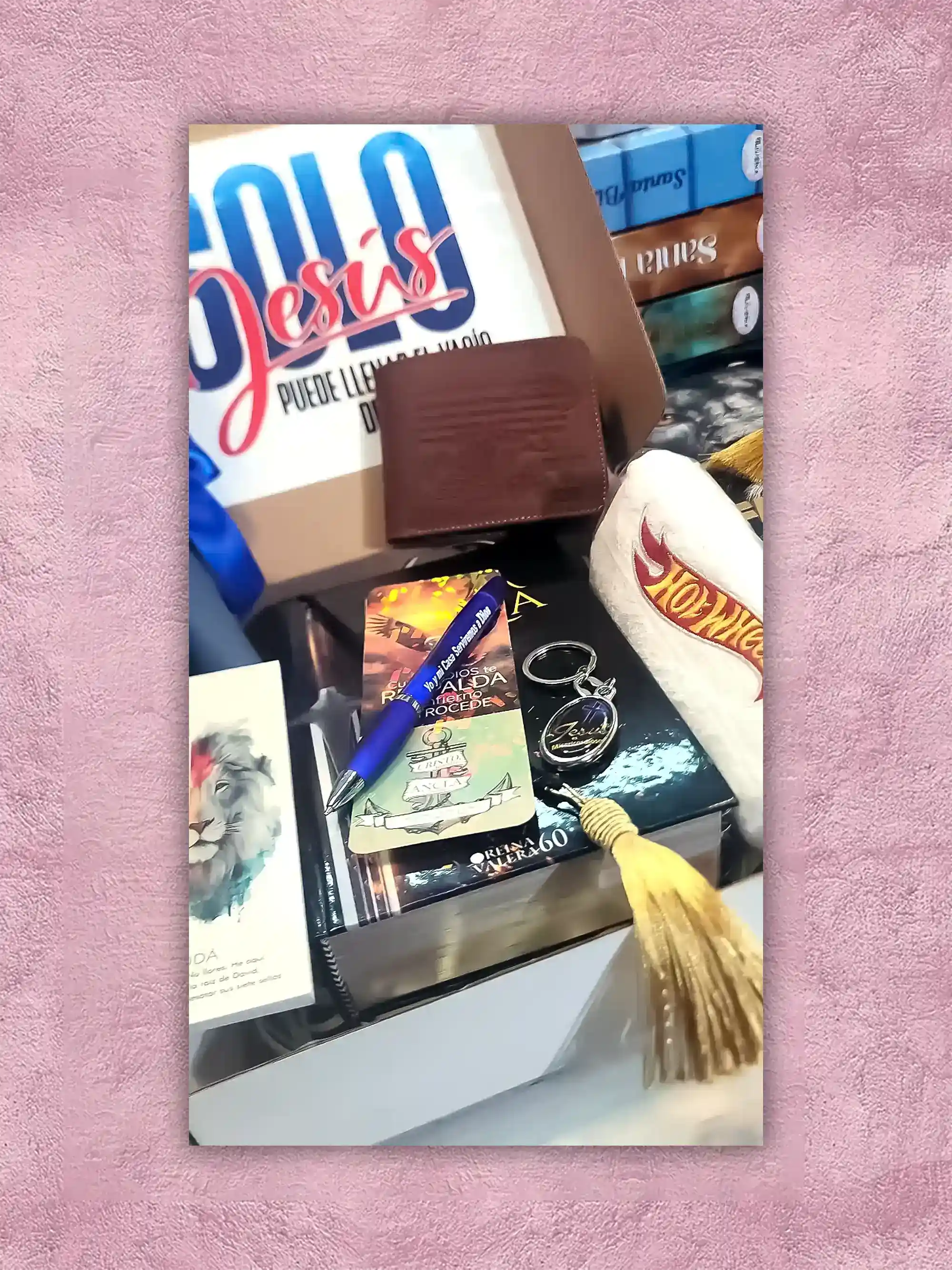 Para ese varón especial, ahora puedes sorprenderlo con este increíble pack de accesorios cristianos y además con una hermosa biblia personalizada que incluye foto dedicatoria, nombre en dorado y borla elegante.